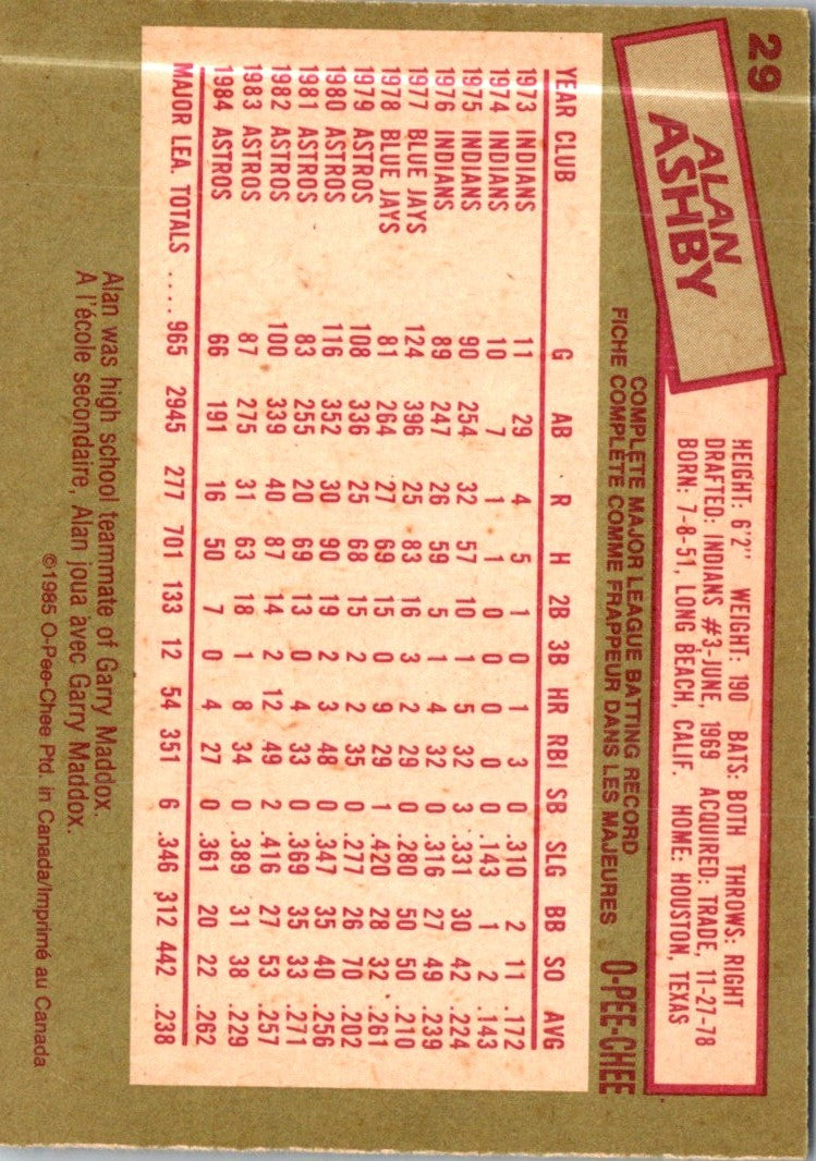 This 1985 O-Pee-Chee Alan Ashby #29Houston Astros card is the perfect addition to any baseball fan's collection. It features a crisp, clear photo of Alan Ashby, as well as detailed stats and team information. This card is sure to be a hit with any Astros fan, regardless of their age. Add this card to your collection today and be the envy of your friends.