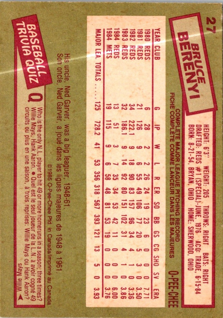 This 1985 O-Pee-Chee Bruce Berenyi #27New York Mets card features a bold blue and orange color scheme. The card features an action shot of Bruce Berenyi in a home Mets jersey. The card is in excellent condition, with sharp corners, crisp colors, and clear imagery. The back of the card features a full-color statistics section, detailing Berenyi's Mets career stats. This card is perfect for any Mets fan, or anyone looking to enhance their collection with a classic piece of sports memorabilia. Add this card to your collection today!