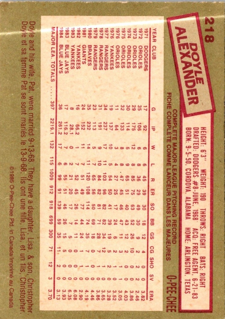 This 1985 O-Pee-Chee Doyle Alexander #218 Toronto Blue Jays card is a must-have for any Blue Jays fan! This card features an action shot of the 7x All-Star, 8x Gold Glove Winner, 15x Silver Slugger Winner, and 1987 NL Cy Young Award Winner. Show your support for one of the greatest pitchers of all time with this classic baseball card! Get yours today!