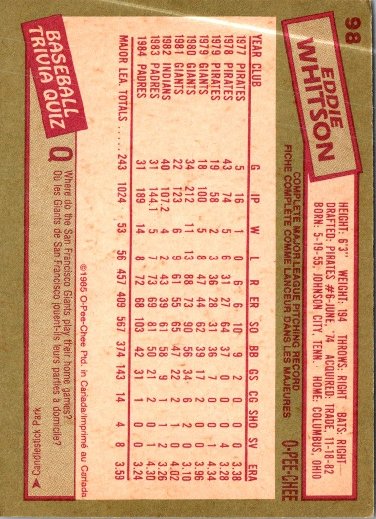 This 1985 O-Pee-Chee Eddie Whitson #98 New York Yankees card is a great way to add a classic piece of Yankees history to your collection. Featuring the talented pitcher in his classic Yankees uniform, this card is a must-have for any Yankees fan. It features a full-color portrait of Whitson, as well as his team name and player number. The back of the card has his career statistics and a brief bio. Add this piece of Yankees history to your collection today!