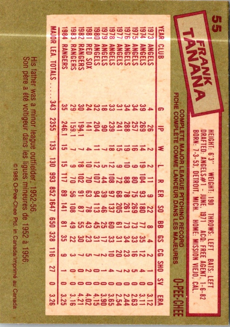 This 1985 O-Pee-Chee Frank Tanana #55 Texas Rangers card is the perfect choice for any baseball fan or card collector. The card features an iconic image of Tanana in his Texas Rangers uniform, making it a great way to commemorate the legendary pitcher's time with the team. The card is in excellent condition, with vibrant colors and sharp corners. Add this card to your collection today and celebrate one of the most memorable players in Texas Rangers history!