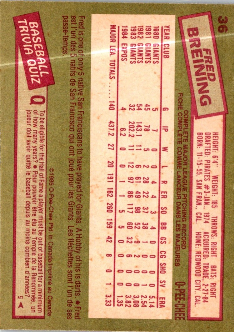 1985 O-Pee-Chee Fred Breining #36