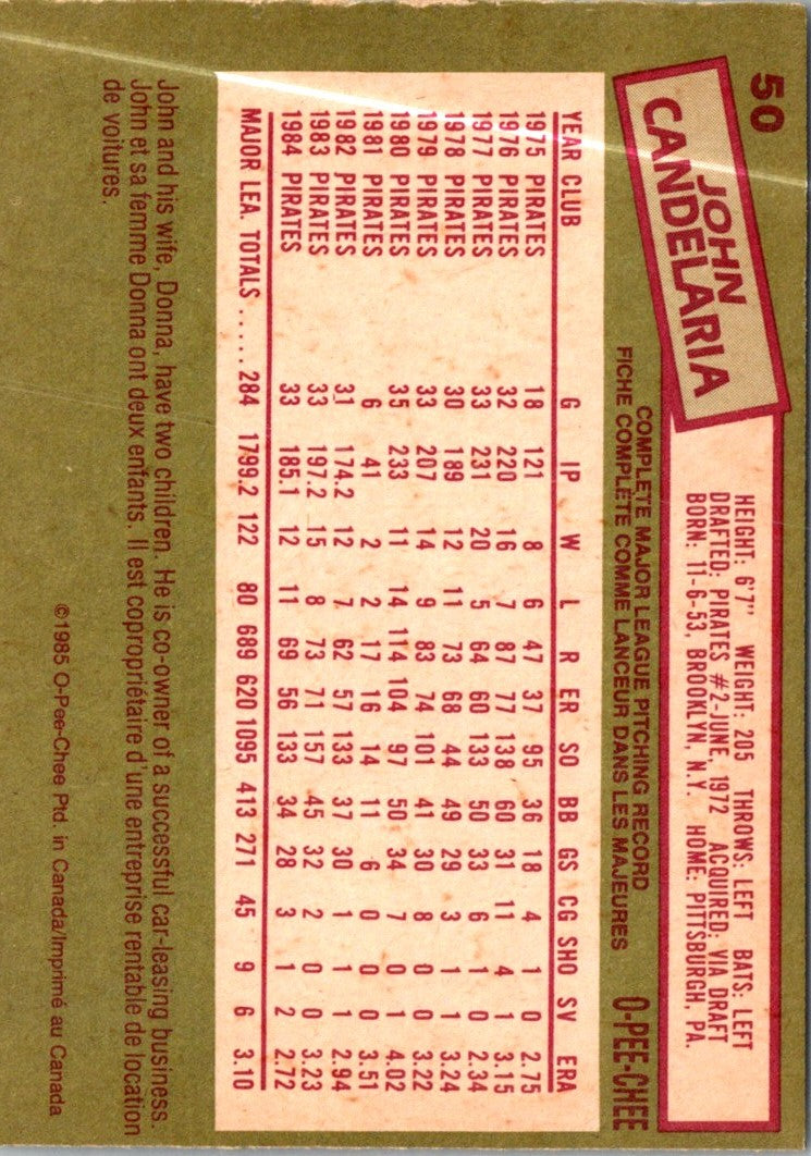 This 1985 O-Pee-Chee John Candelaria #50 Pittsburgh Pirates card is a great addition to any collection! This card features a classic image of the former Pirates pitcher in his iconic white uniform. It details his career stats, including his two All-Star appearances and World Series victory in 1979. With a glossy finish, this card is the perfect way to show your support for the Pirates! Add this one-of-a-kind item to your collection today!
