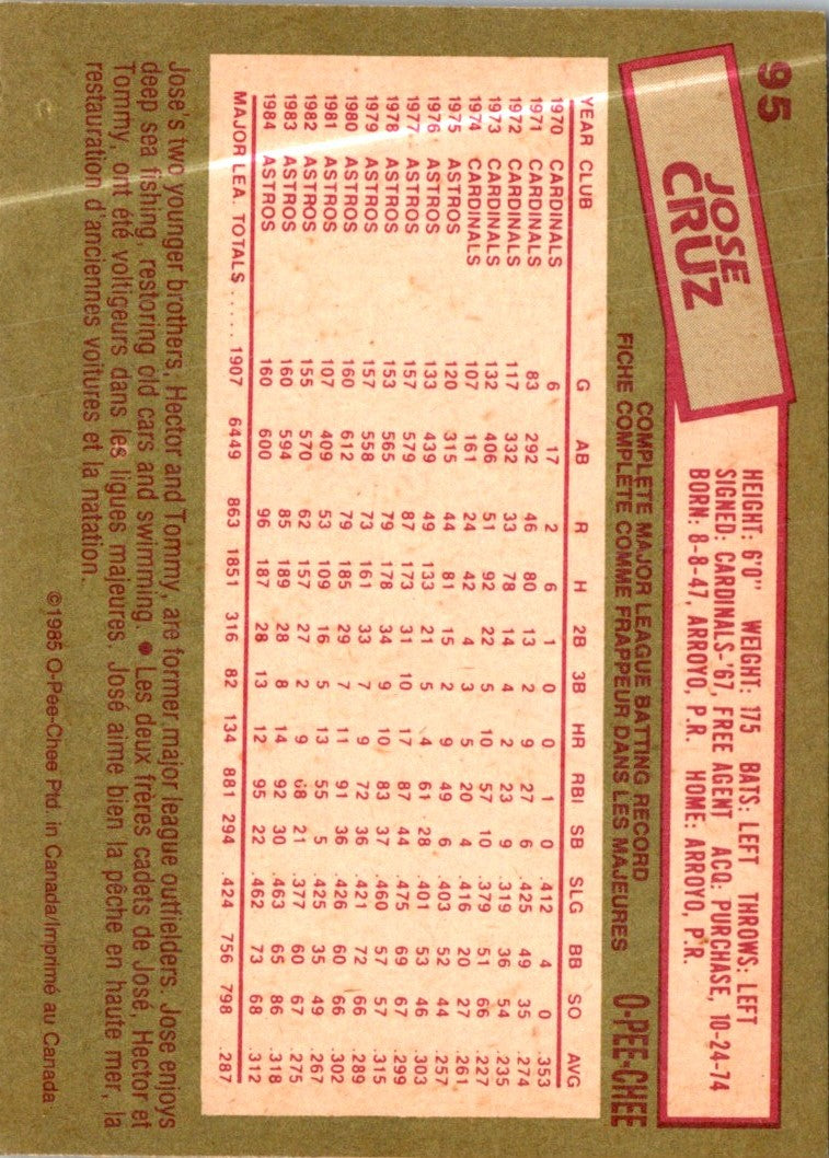 This 1985 O-Pee-Chee Jose Cruz #95 Houston Astros Baseball Card is a must-have for any fan of the Houston Astros! Featuring Cruz in his iconic Astros jersey and cap, this card is an awesome addition to your Astros memorabilia collection. This card is in excellent condition and is sure to be a conversation starter. Add this card to your Astros collection today!