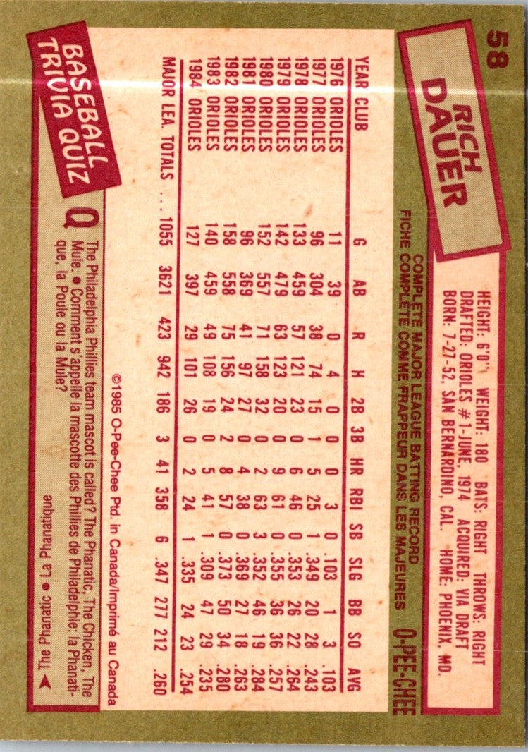 This 1985 O-Pee-Chee Rich Dauer #58 Baltimore Orioles card is a must-have for any baseball fan! Featuring a full-color glossy photo of Rich Dauer in his Orioles uniform, this card is sure to add a touch of nostalgia to your collection. The card is in mint condition and features all the stats and info you need to know about Rich Dauer's 1985 season. This card is perfect for any Orioles fan looking to add a classic piece to their collection. Get your hands on this 1985 O-Pee-Chee Rich Dauer #58 Baltimore Orioles card today!