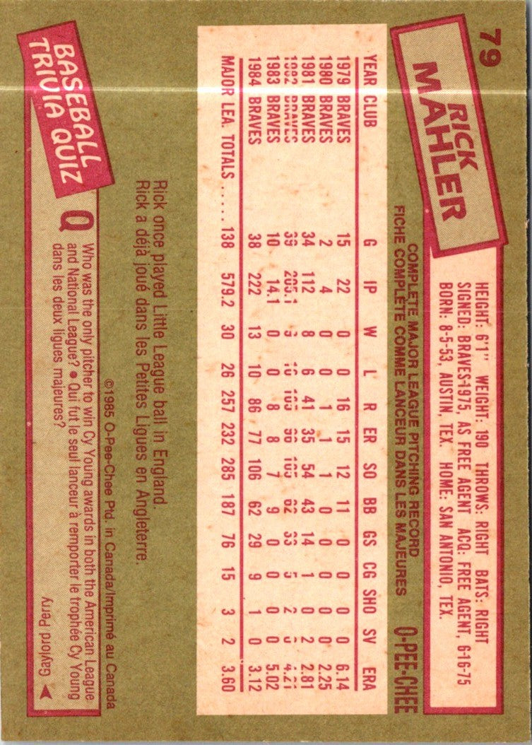 1985 O-Pee-Chee Rick Mahler #79 Atlanta Braves is an essential for any Braves fan. This card features a great action photo of Mahler in his home uniform, with the Braves logo printed in the background. The back of the card displays Mahler's vital stats, including his impressive career record of 125-108. Add this card to your collection and show your Braves pride!