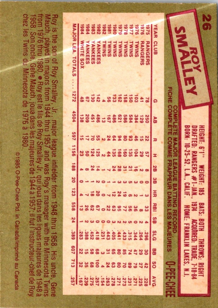 This 1985 O-Pee-Chee Roy Smalley #26 Minnesota Twins trading card is the perfect addition to any collector's item. Featuring a crisp image of Smalley in his Twins jersey, the card is a great way to show your support of the Minnesota Twins. The card is in excellent condition, with no signs of wear or tear. It is the ideal choice for any fan of the team, or of Smalley himself. Get your hands on this timeless piece of history today!