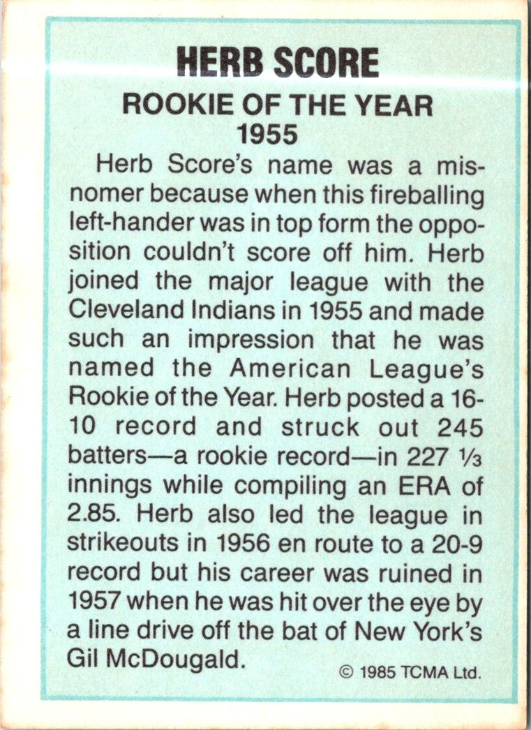 Description: 1985 TCMA Rookies of the Year Herb Score #NNO