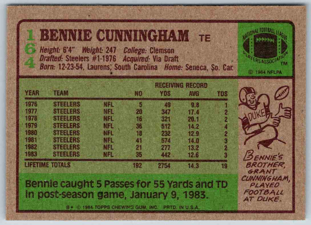 This 1985 Topps Bennie Cunningham #164 card is the perfect addition to any sports fan's collection. The card features an iconic image of Cunningham in action on the field, showcasing his unique skills as a tight end. The card also includes a detailed biography of Cunningham's career stats and accomplishments. This card is sure to bring a smile to any collector's face, as it is a reminder of all of the great moments Cunningham provided on the field. It is a must-have for any Cunningham fan or collector of sports memorabilia.