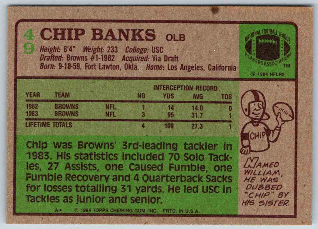 This 1985 Topps Chip Banks #49 is the perfect addition to any sports fan's collection. Featuring an iconic image of Chip Banks in his Cleveland Browns uniform, this card looks great framed and displayed. The card is in mint condition, with crisp corners and vibrant colors that will stand the test of time. With its beautiful design and classic team colors, this card is sure to bring a touch of nostalgia to any room. Add this card to your collection today and honor the legacy of Chip Banks.