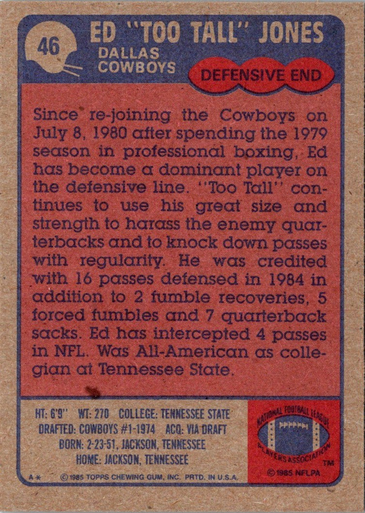 This 1985 Topps Ed Too Tall Jones #46 card is a unique collector's item! The card features a stunning portrait of Ed Too Tall Jones, former defensive end for the Dallas Cowboys. This card is a must-have for any Cowboys fan or card collector, capturing the heart and spirit of the team. This card is perfect for adding to your collection or for framing and displaying in your home or office. Get your hands on this piece of Cowboys history today!