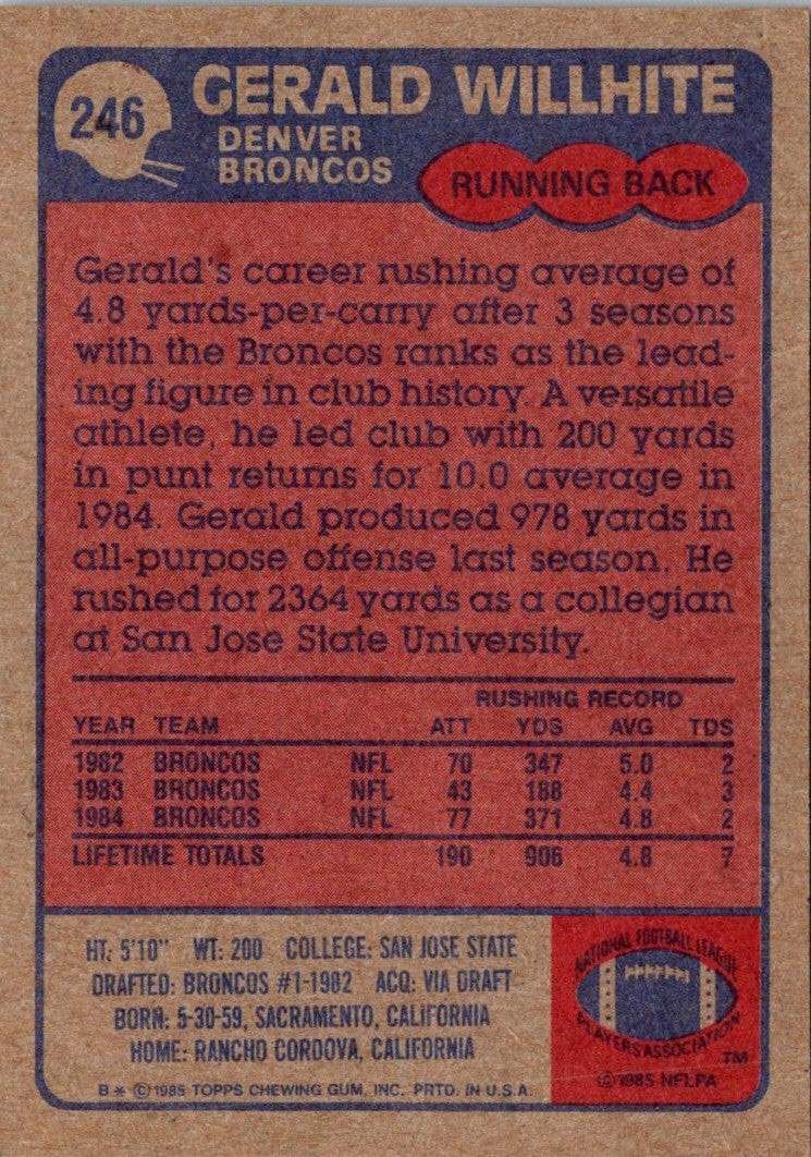 One of the most iconic sports cards of the 1980s is the 1985 Topps Gerald Willhite #246. Featuring the Denver Broncos running back in a vibrant blue and orange uniform, this card is a must-have for any Broncos fan! With a bold team logo and a powerful action shot, this card will look great in any collection. The reverse of the card features Willhite's career stats and a brief biography, adding to its collectability. Don't miss your chance to own this classic piece of NFL history!