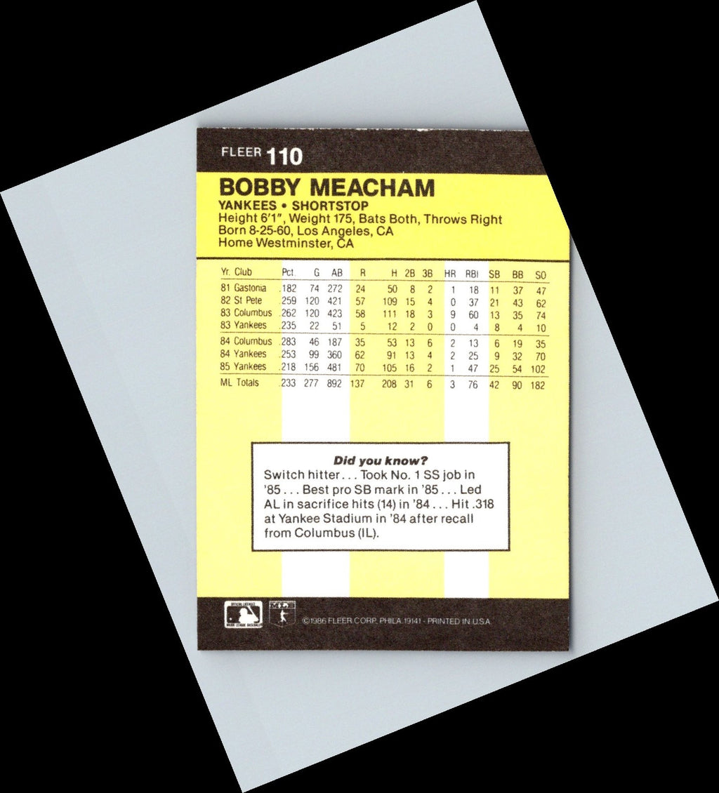 This 1986 Fleer Bobby Meacham #110 New York Yankees is the perfect addition to any baseball lover's collection. Featuring the classic Yankees logo, this card is sure to bring back memories of the team's glory days. Meacham is one of the most beloved Yankees of all time, and this card captures him in all his glory. The perfect way to show your love for the Bronx Bombers, this card is sure to be a treasured item for years to come. Add this timeless piece to your collection today!