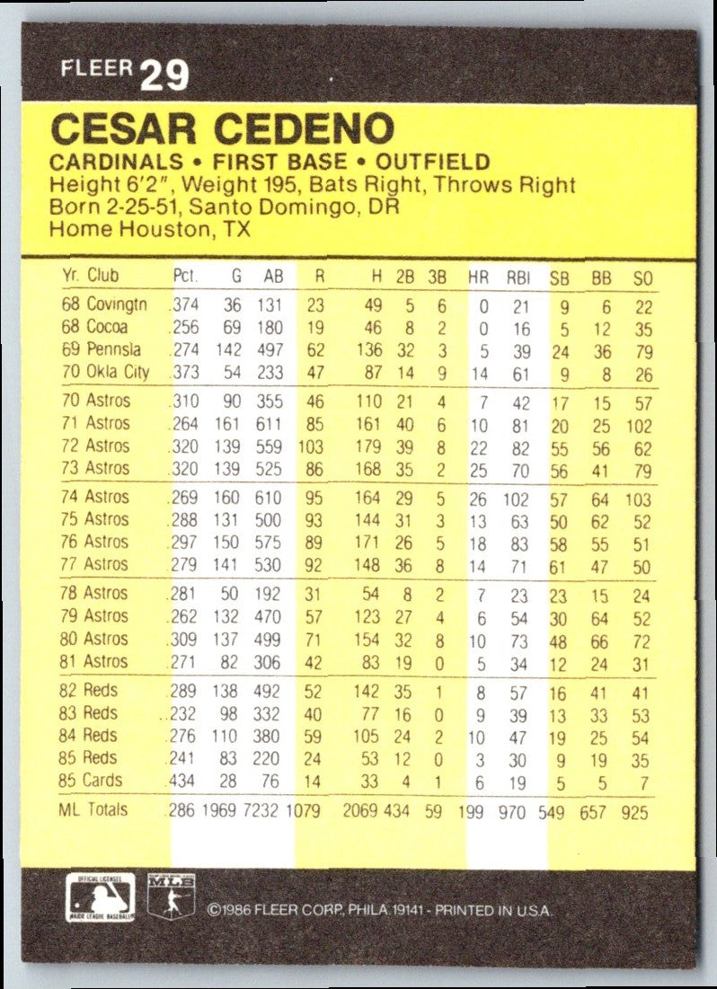 This 1986 Fleer Cesar Cedeno #29 St. Louis Cardinals card is the perfect addition to any collector's deck. Featuring a crisp, clear image of the legendary outfielder on the front, this card is sure to make a great addition to any collection. The back of the card includes Cedeno's full career stats and a brief bio. This card is a must-have for any Cardinals fan, and any fan of the game of baseball. Add this classic card to your collection today!