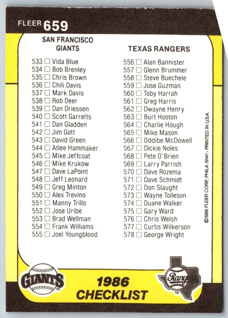 1986 Fleer Checklist: Brewers/Braves/Giants/Rangers #659