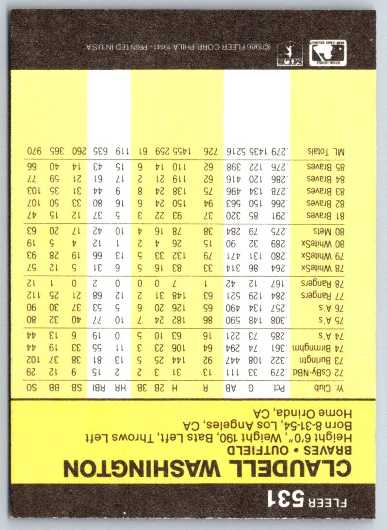 This 1986 Fleer Claudell Washington #531 Atlanta Braves card is in mint condition and features a classic image of Washington in his Braves uniform. It's a great addition to any collection as it captures a key moment in Braves history. The card is professionally produced with high-quality glossy stock, and is sure to stand out in any collection. Don't miss the chance to own a piece of Braves history!