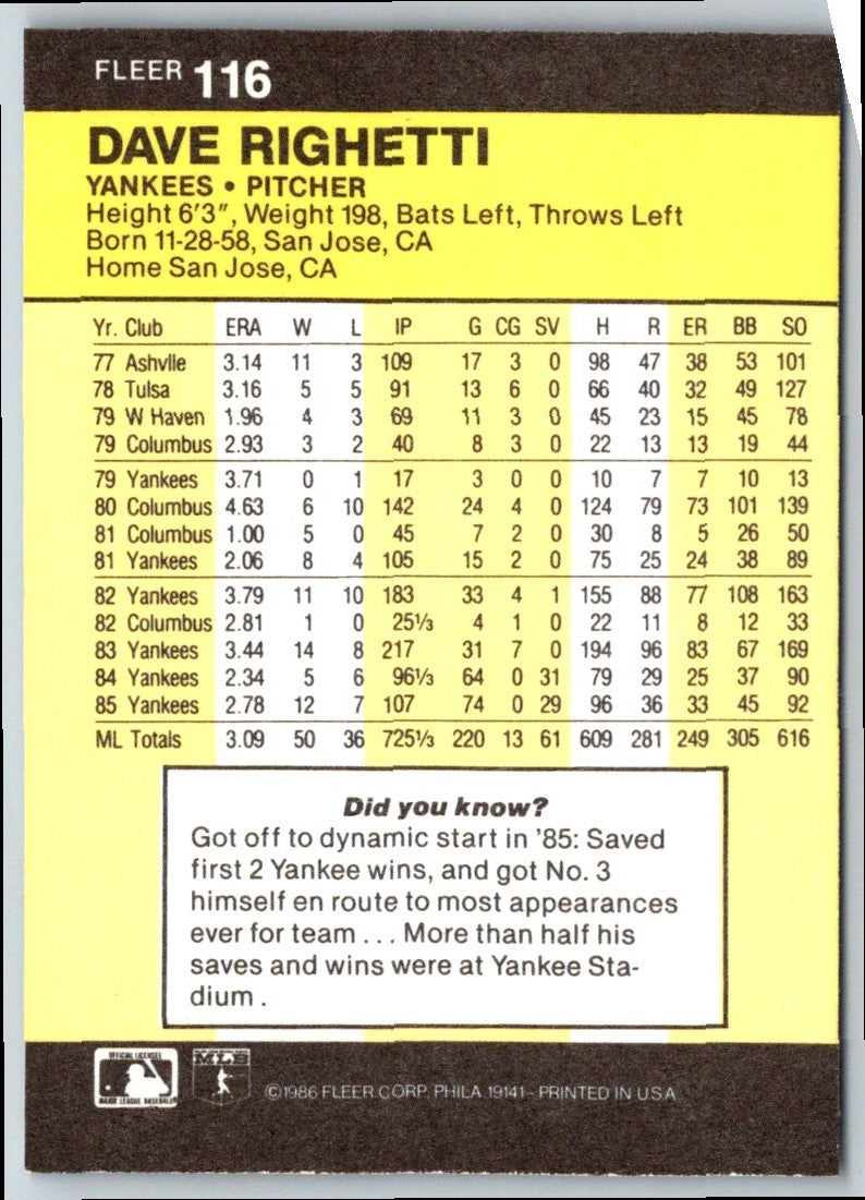 This 1986 Fleer Dave Righetti #116 New York Yankees card is a must-have for any baseball card collector! Featuring a classic image of Dave Righetti on the mound, this card is sure to be a great addition to your collection. It is in great condition with sharp corners and vibrant colors. This card is the perfect way to honor the great pitcher and show off your love of the Yankees. Don't miss out - add this card to your collection today!