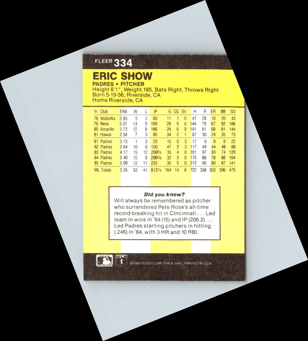 The 1986 Fleer Eric Show #334 San Diego Padres card showcases one of the most iconic players of the 80s. Show was a promising young pitcher who showed immense potential in his first full season with the Padres. Boasting an impressive stat line of 10 wins, 8 losses, and a 2.80 ERA during the season, this card is a must-have for any baseball fan or collector. Show's image is bold and vibrant, with a classic Padres logo in the background. Add this classic card to your collection today and remember one of the greatest Padres of all time.