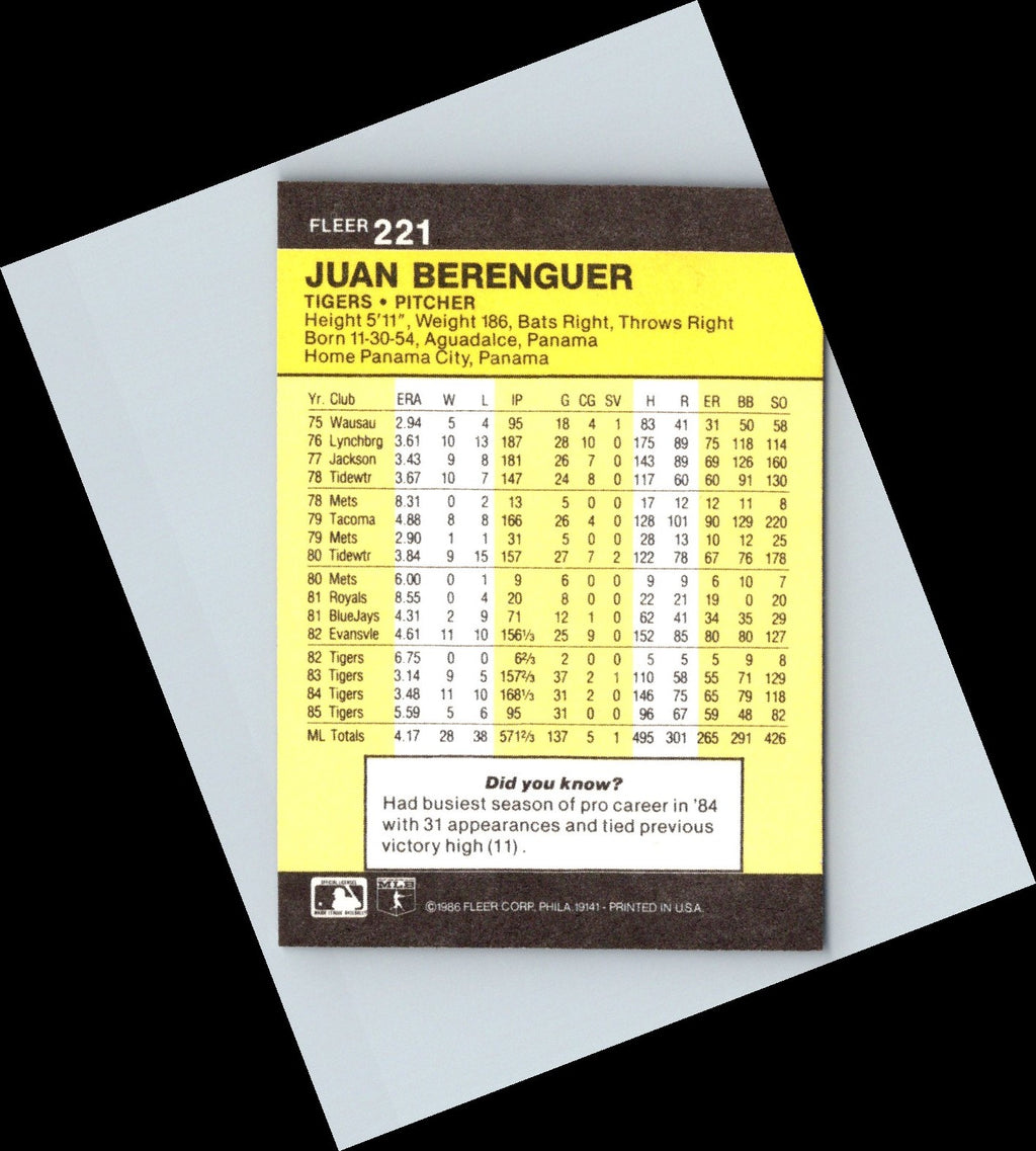 This 1986 Fleer Juan Berenguer #221Detroit Tigers card is the perfect addition to any dedicated Detroit Tigers fan's collection! Featuring a striking full-color illustration of Berenguer in his Tigers uniform, the card is in near mint condition and is a must-have for any fan! Berenguer was a key member of the Tigers roster in 1986, and this card is a great way to relive his season and add a piece of Tigers history to your collection. Add this Juan Berenguer card to your collection today and celebrate the Detroit Tigers' great history!