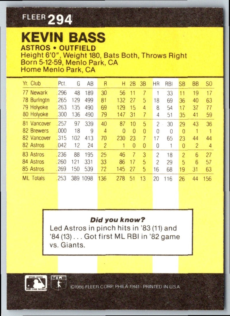 This 1986 Fleer Kevin Bass #294 Houston Astros card is a must-have for any collector or fan of the Houston Astros. This card features a great photo of Bass in action, and the colorful borders and graphics make it a great addition to any collection. The reverse side of the card offers an impressive stat line for Bass, showing his impressive career numbers. This card is sure to be a great conversation piece and a great way to show your support for the Houston Astros. Add this card to your collection today!