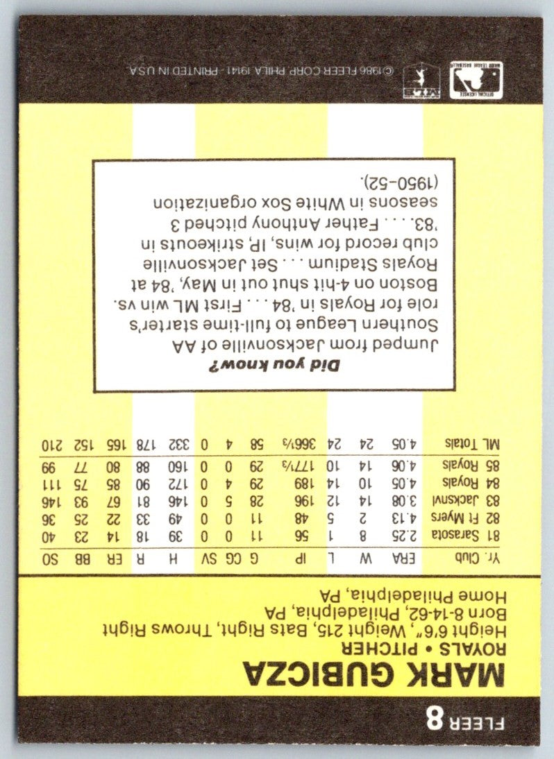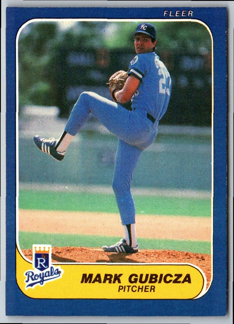 Mark Gubicza was an All-Star pitcher for the Kansas City Royals. This 1986 Fleer card presents a classic image of Gubicza in his Royals uniform, with a white background and a blue and white border. The card also features a brief biography on the back. This card is sure to be a great addition to any Royals fan's collection, and is an excellent way to honor this great pitcher's legacy.