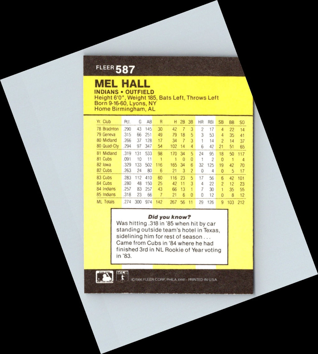 This 1986 Fleer Mel Hall #587 card is a must-have for any Cleveland Indians fan! Hall was a key part of the Indians roster for over 10 years, and this card commemorates his career as a four-time All-Star. The card features a full-color, glossy photo of Hall in his classic batting stance. The reverse side contains a detailed summary of his career highlights and personal information. Add this iconic card to your collection today!