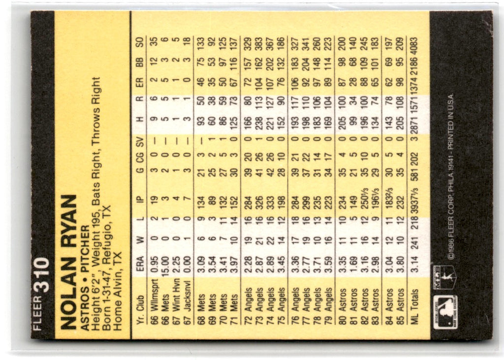 Description: 1986 Fleer Nolan Ryan #310