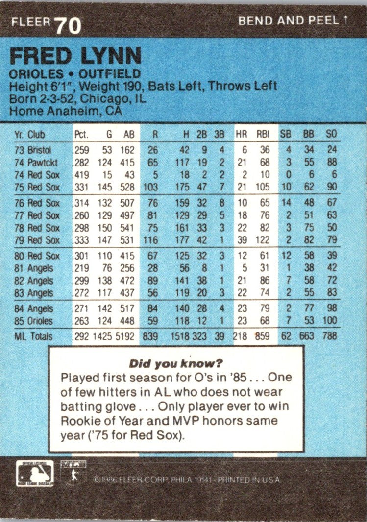 This 1986 Fleer Star Sticker of Fred Lynn is a must-have for any Baltimore Orioles fan! The sticker features a close-up of the outfielder in his Orioles jersey, perfect for adding to your collection. The card is in great condition and showcases the classic vintage design of the '86 Fleer Star Sticker set. Put this classic Fred Lynn card in your collection today and show your Orioles pride!