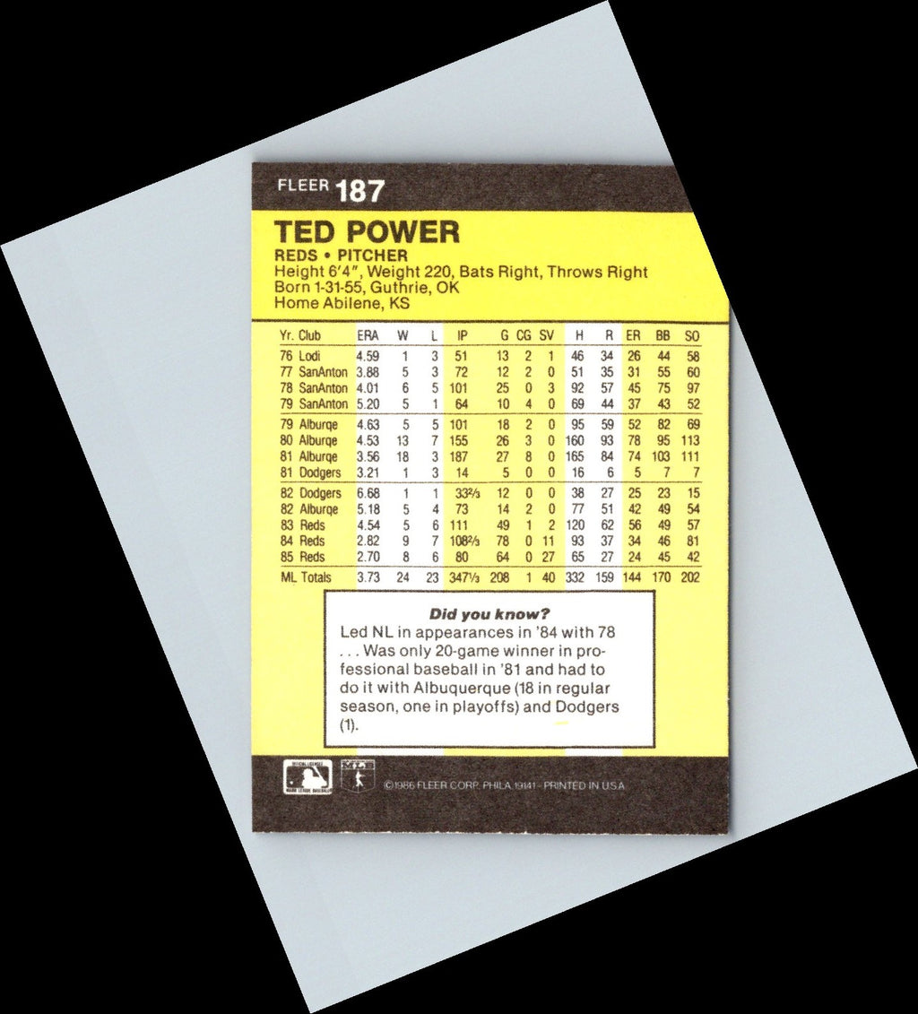This 1986 Fleer Ted Power #187 Cincinnati Reds trading card is a great addition to any fan's collection. Featuring a glossy photograph of Power in his Reds uniform, the card captures the pitcher's passion and commitment to the team. It's a great way to commemorate his years of service to the Cincinnati Reds. With precise printing and vibrant colors, this card is sure to stand out in your collection. Add this card to your collection today and relive Power's legendary success with the Cincinnati Reds.
