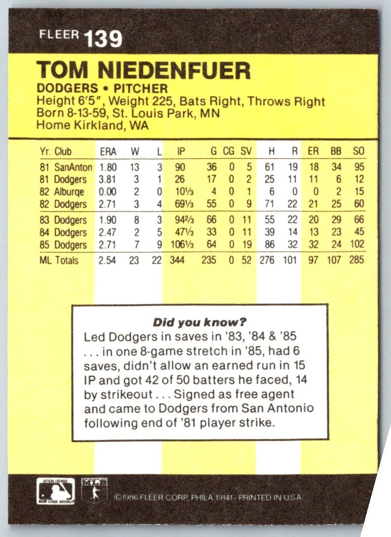 This 1986 Fleer Tom Niedenfuer #139 from the Los Angeles Dodgers is a great addition to any sports collection. Featuring a classic image of the pitcher in his Dodgers uniform, this card will bring back memories of the team's glory days. Show your team spirit and add this card to your collection today.