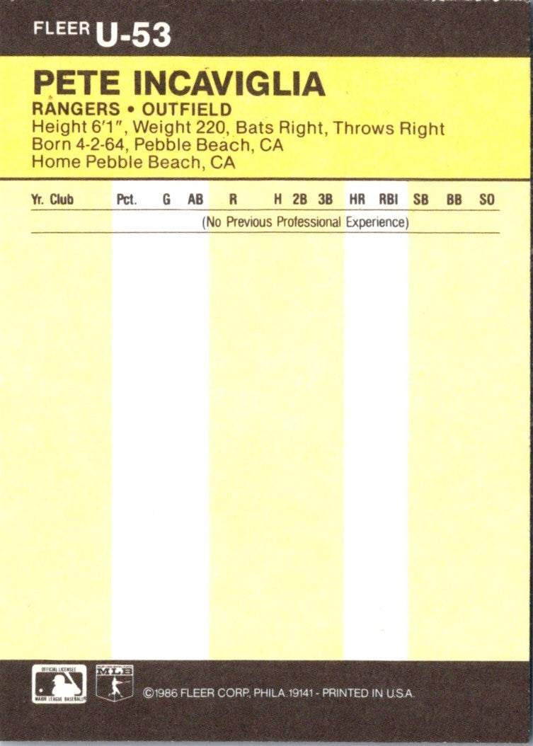 Description: 1986 Fleer Update Pete Incaviglia #U-53