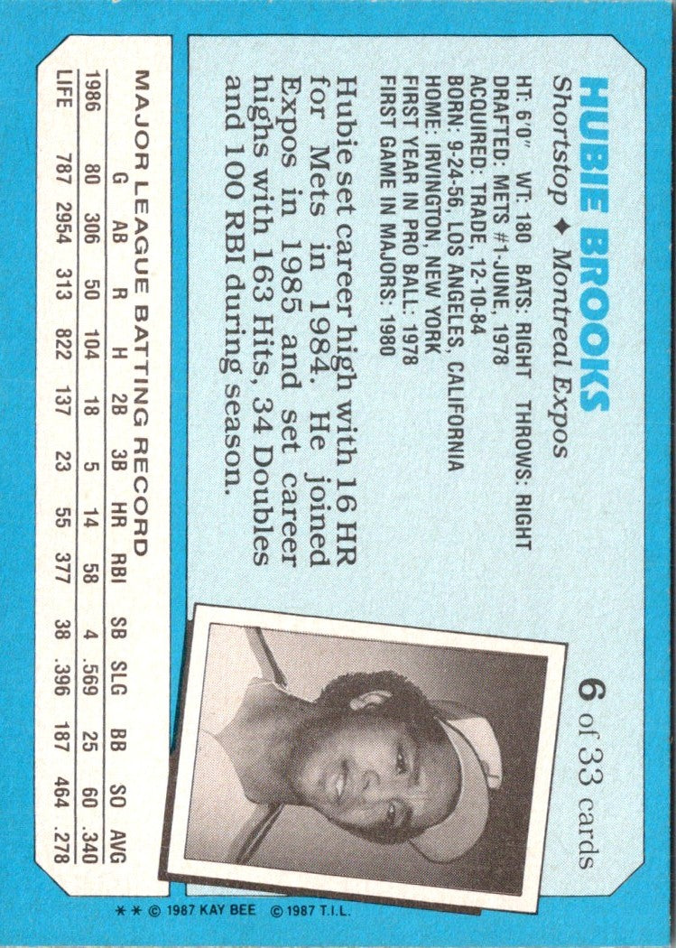 This 1986 Kaybee Kings Hubie Brooks #187 Montreal Expos is the perfect addition to any baseball fan's collection! Featuring a detailed and vibrant design, this card is sure to bring any collection to life. From Hubie's signature stance to his iconic batting helmet, this card is a must-have for Expos fans of all ages. This card is sure to become an instant classic and will make a great addition to any fan's collection. Add this iconic card to your collection today!