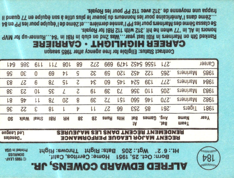 This 1986 Leaf Al Cowens #184 Seattle Mariners card is a must-have for sports card collectors. Featuring a bright, full-color image of Cowens in his Mariners uniform, this card is sure to add a unique and vibrant touch to your collection. Printed on glossy card stock, the card is sure to remain in pristine condition for years to come. The reverse of the card contains detailed statistical information about Cowens' remarkable career. Add this classic collectible to your collection today!