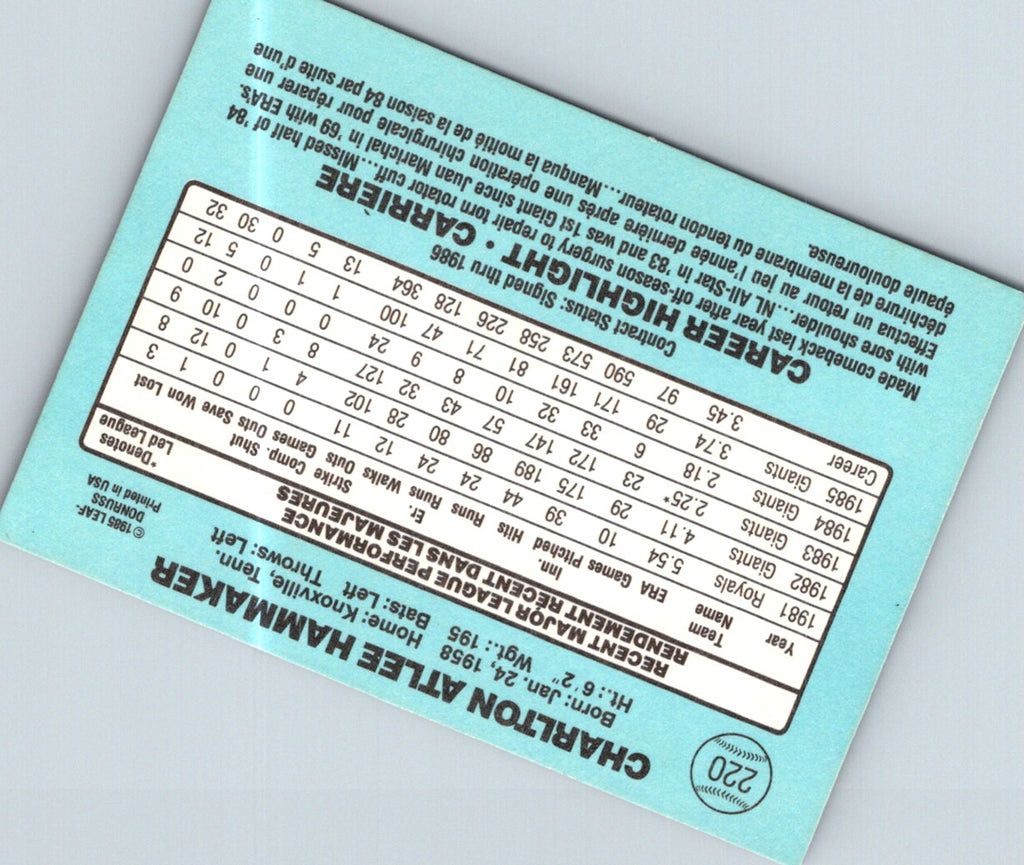 This classic 1986 Leaf Atlee Hammaker #220 card is a must-have for any San Francisco Giants fan! It features the famous pitcher mid-throw in his signature style, with a bold gold-on-blue design that will stand out in any collection. The card is in excellent condition and would make a great addition to any memorabilia enthusiast's collection!