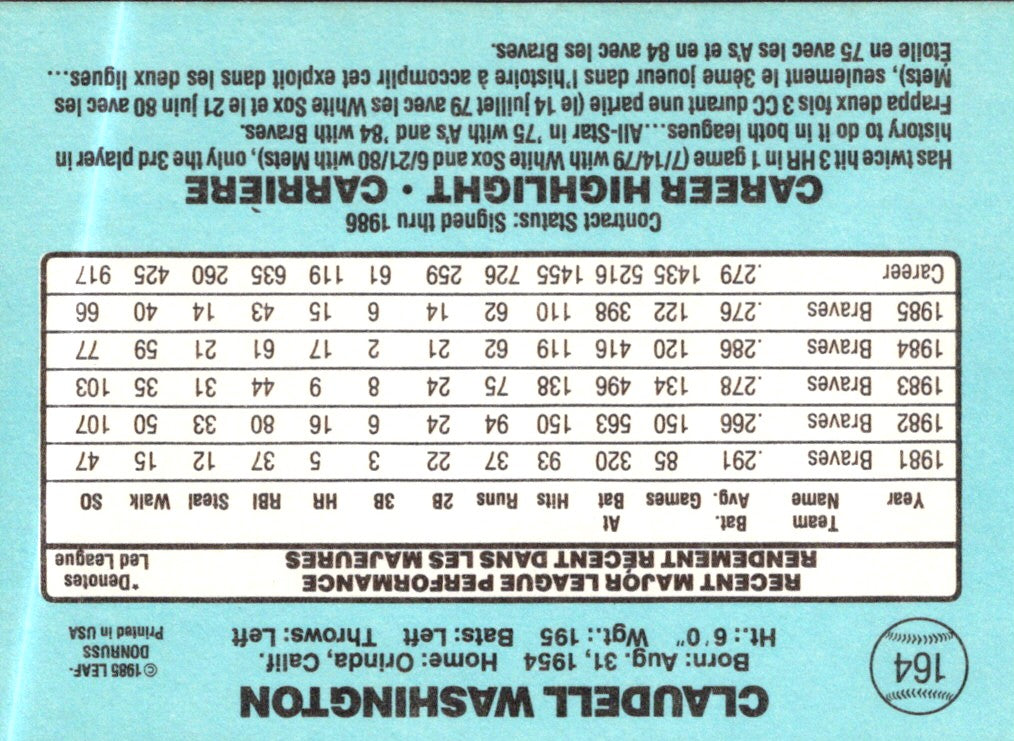 This 1986 Leaf Claudell Washington #164 Atlanta Braves card is a must-have for any Braves fan or sports card collector. Featuring a vibrant full-color photo of Washington in his classic Braves uniform, this card is sure to bring back memories of a simpler time in the sport. With sharp edges and corners, this card is in great condition, with no fading or discoloration. Whether you are looking to start or add to your sports card collection, this is an essential piece to own.