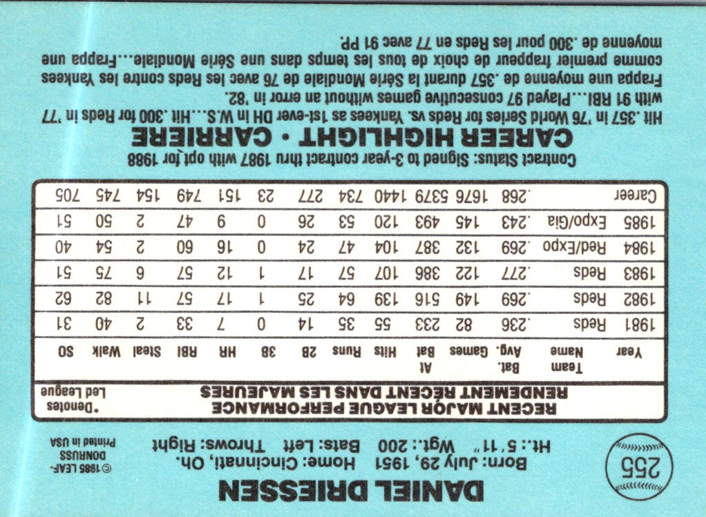 This 1986 Leaf Dan Driessen #255 card features a great action shot of the San Francisco Giant's star player! Dan Driessen, a 5-time All-Star, was an integral part of the Giants' success in the 1980's. The card has a bright and colorful design that will look amazing in your collection. This card is a must-have for all Giants fans and card collectors alike! Add it to your collection today and show your support for a great baseball player!