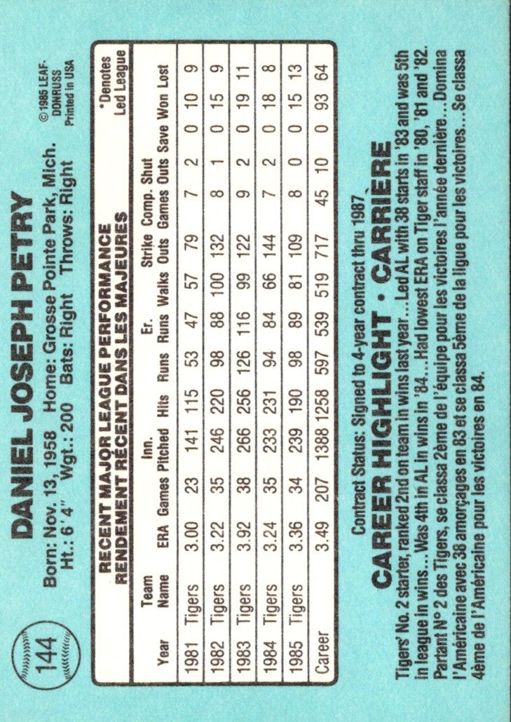 This 1986 Leaf Dan Petry #144 Detroit Tigers card is a must-have for any fan of the Tigers or baseball in general. The card features a full color photo of Petry pitching in his Tigers uniform, along with his name, team name and stats. Petry, who was an All-Star in 1984, had a successful career with the Tigers, including a 20-8 record in the 1985 season. He also pitched for the California Angels, Boston Red Sox, and St. Louis Cardinals during his career. This card is a great way to commemorate the career of this baseball great and make your collection stand out. Add this card to your collection today!