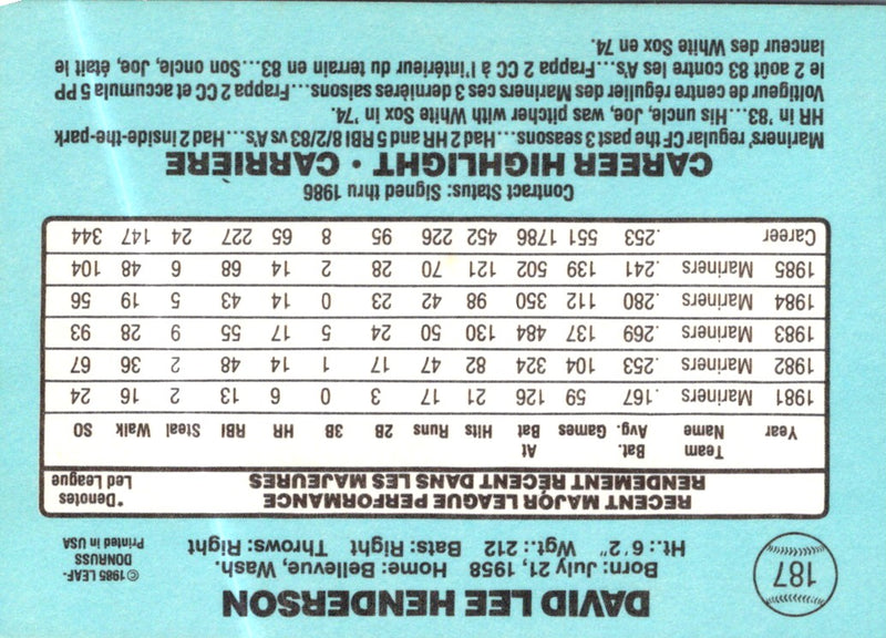 This 1986 Leaf Dave Henderson #187 card from the Seattle Mariners is a must-have for any collector. Featuring Henderson in an iconic batting stance, this card is a great representation of the Mariners during the mid-80s. The card is in excellent condition, with vibrant colors and sharp detail. Add this card to your collection today and celebrate one of the Mariners' most memorable players.