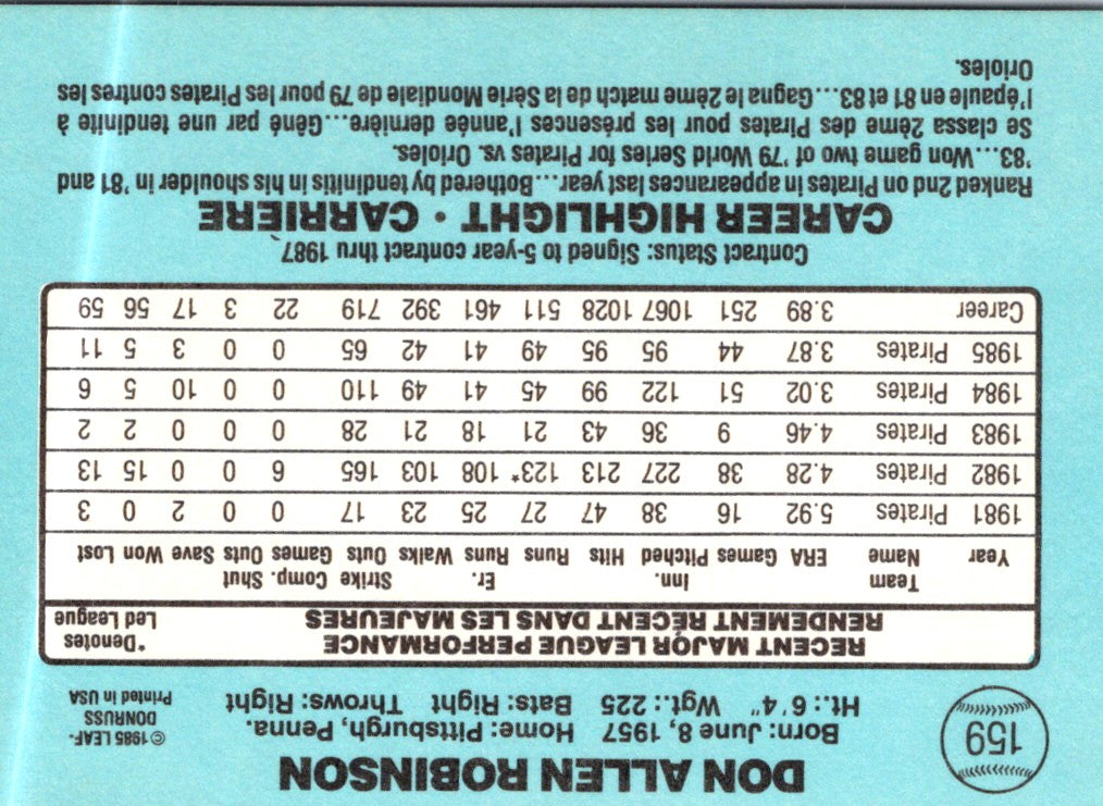 This 1986 Leaf Don Robinson #159 Pittsburgh Pirates card is a must-have for any baseball fan! Featuring a great shot of Robinson in his Pirates uniform, this card celebrates the career of one of the most talented pitchers of the '80s. The card features detailed stats on the back, making it a great addition to any collection. Don't miss your chance to add this classic card to your collection today!