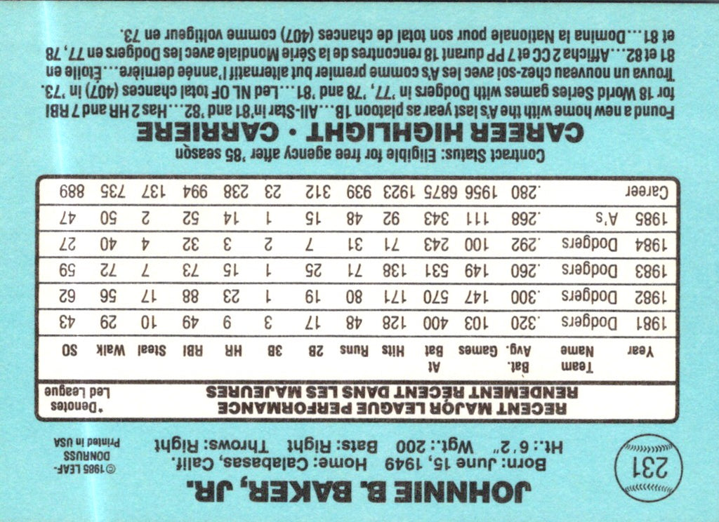 This 1986 Leaf Dusty Baker card is a must-have for any Oakland Athletics fan. Featuring a bold, full-color photograph of the All-Star outfielder, this card captures Baker in mid-swing and is sure to be a great addition to any A's fan's collection. With a glossy finish and vibrant colors, this card will make a great souvenir or gift for any baseball enthusiast. Own a piece of baseball history with this timeless 1986 Leaf Dusty Baker card!