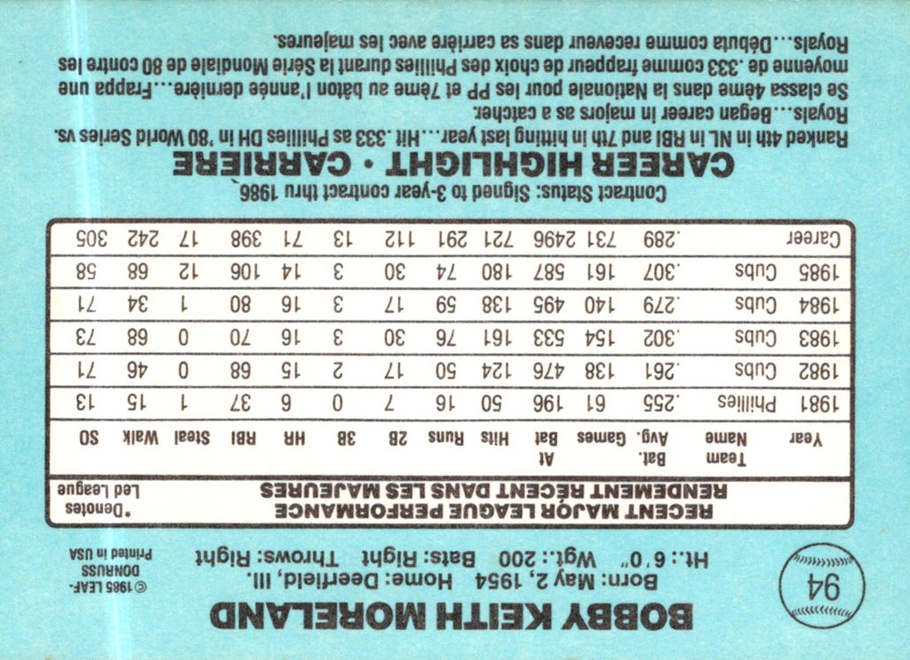 This 1986 Leaf Keith Moreland #94 card features the beloved Chicago Cubs infielder in action. With this card, celebrate the career of one of the most popular Cubs players of all time. The card is in excellent condition and is a must-have item for any Cubs fan. The card features a sharp and vivid image of Moreland that captures the intensity of the game. Get your hands on this historic card and add it to your collection today!