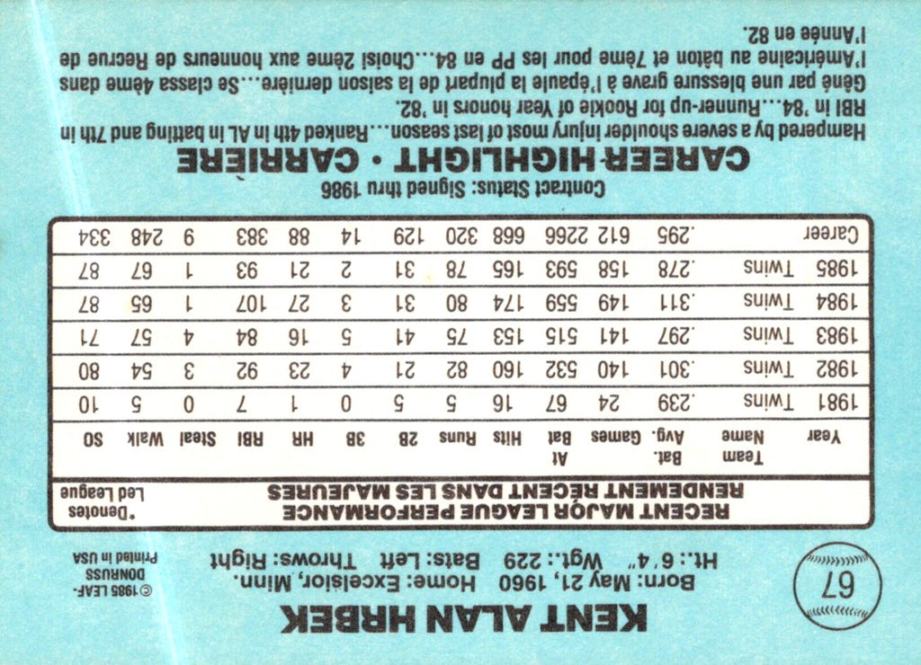 This 1986 Leaf Kent Hrbek #67 Minnesota Twins card features the iconic infielder in a classic pose. An 8-time All-Star, Hrbek was a critical part of the Twins' World Series-winning teams in 1987 and 1991. With this card, you can add a piece of baseball history to your collection. Featuring a sharp glossy finish and vibrant colors, it's sure to stand out from your other cards. Get your hands on this classic card today and add it to your prized collection!