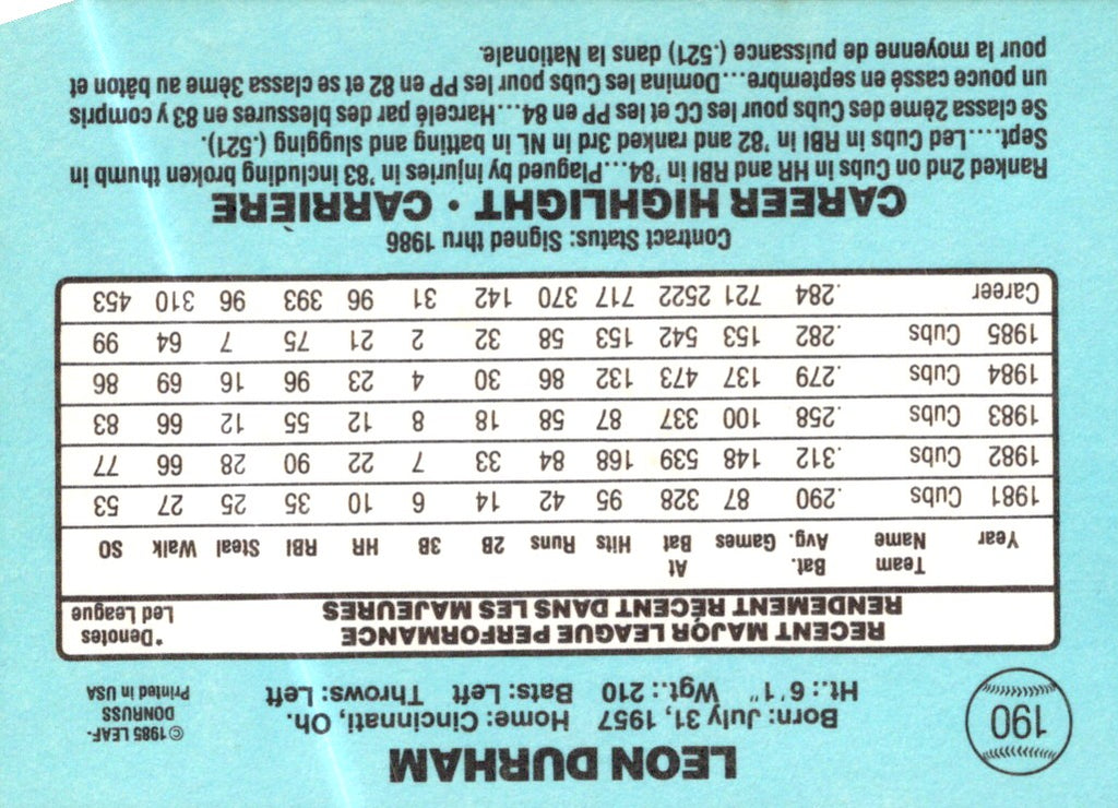 This 1986 Leaf Leon Durham #190 card from the Chicago Cubs is the perfect addition to any card collection. Featuring a large portrait photo of Leon Durham, this card captures the veteran player in his iconic batting stance. The reverse side of the card includes a short biography and career stats for Leon Durham. This card is a must-have for any Cubs fan or baseball card enthusiast. Add this prized piece of memorabilia to your collection today!
