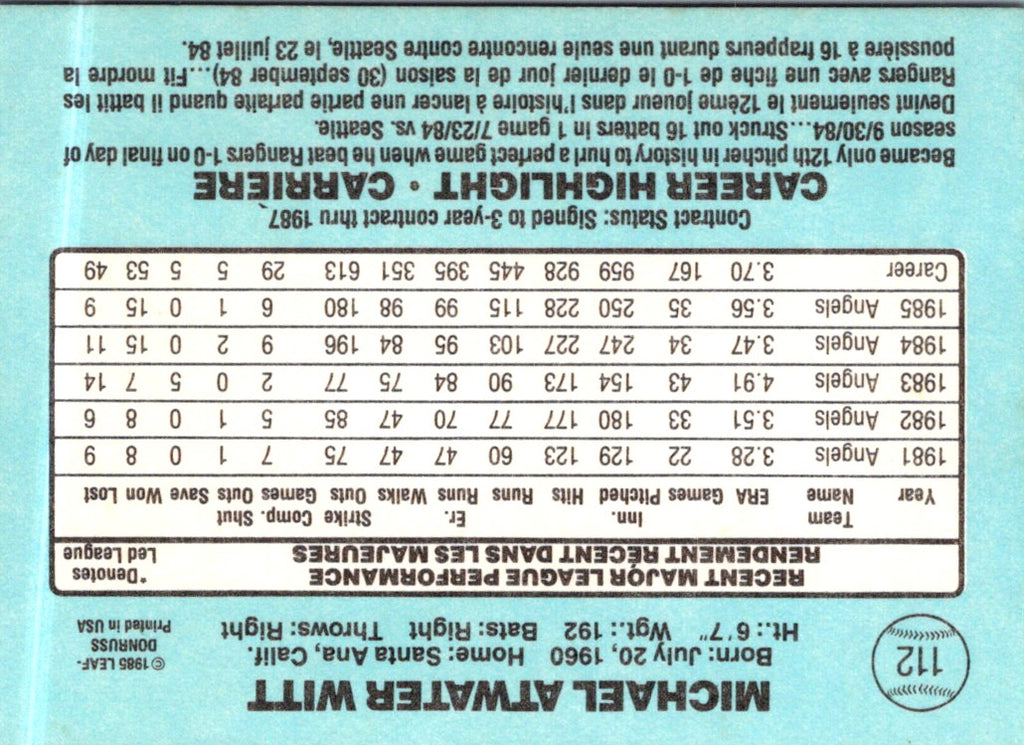 This 1986 Leaf Mike Witt #112 card is an absolute must-have for any California Angels fan! Featuring one of the team's most celebrated pitchers, this card captures the energy of the game in a unique way. With its bold colors and dynamic design, this card is sure to stand out in any collection! Get your hands on this timeless collectible and show your loyalty to the Angels!