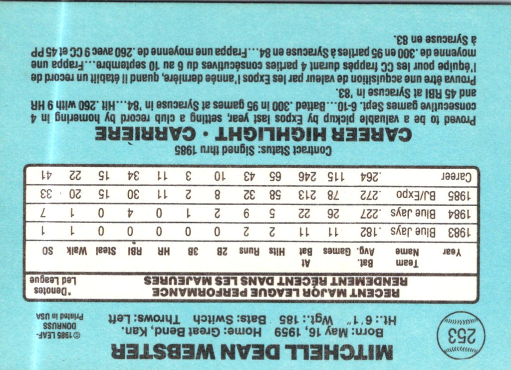 Description: 1986 Leaf Mitch Webster #253