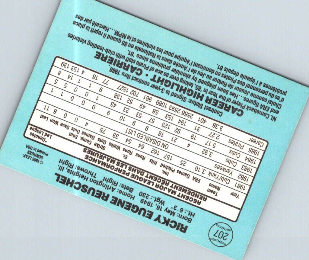 This 1986 Leaf Rick Reuschel #207 card is an incredible addition to any Pittsburgh Pirates fan's collection! Reuschel was a starting pitcher who was an All-Star in 1978 and 1979, and a member of the Pirates from 1977-1985. This card features a great action shot of Reuschel in his Pirates jersey. The card is in near mint condition and would be an amazing addition to any Pirates fan's memorabilia collection. So don't miss out on this classic card and add it to your collection today!
