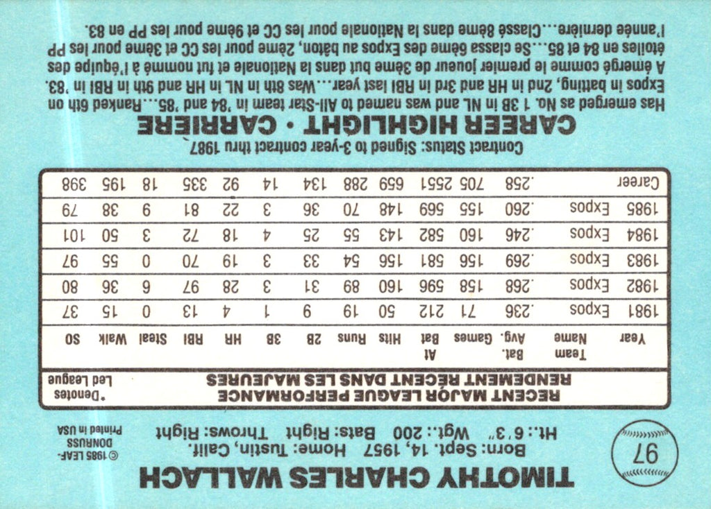 This 1986 Leaf Tim Wallach #97 Montreal Expos card is a real treasure for any fan of the Expos or collector of baseball cards. Wallach was a star third baseman for the Expos, and this card captures him in a classic batting pose. The card is in great condition, featuring a sharp, vibrant image and strong corners. It would make a great addition to any collection.