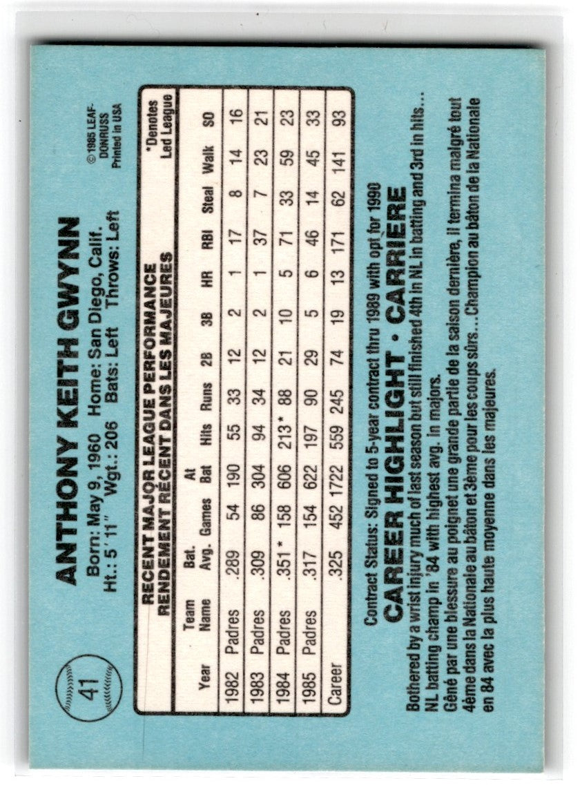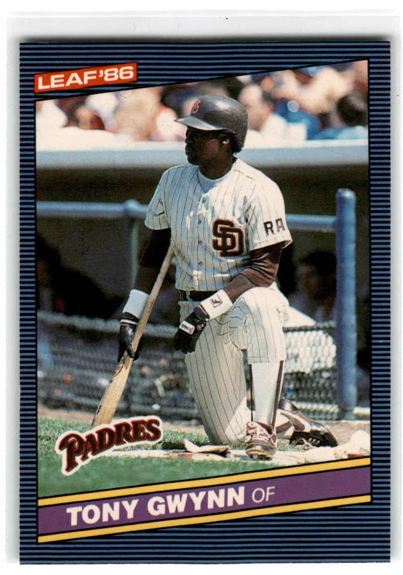 This 1986 Leaf Tony Gwynn #41 San Diego Padres card is the perfect addition to any collection! Featuring a portrait of the legendary Padres outfielder in his signature batting stance, this card captures the essence of Tony Gwynn's career. It's a must-have for any fan of the Padres or baseball in general. With its vibrant colors and detailed design, this card is sure to stand out and take pride of place in any collection. Get your hands on this classic card today and pay tribute to the great Tony Gwynn!