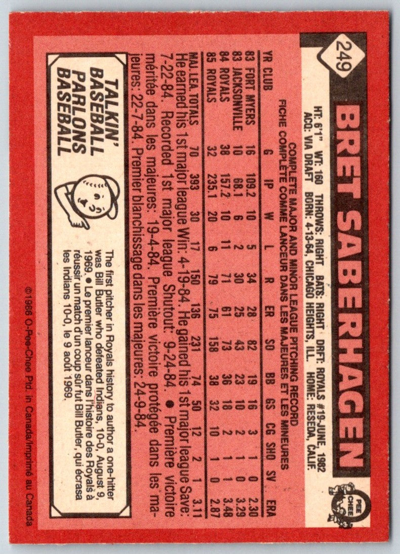 This 1986 O-Pee-Chee Bret Saberhagen #249 Kansas City Royals card is a great piece for any baseball fan! Featuring a full-color photo of the star pitcher in his Royals uniform, this card is sure to be a great addition to any collection. Saberhagen had an All-Star season in 1986, leading the American League in ERA and finishing second in the AL Cy Young Award voting. This card captures the peak of his career and will be a great reminder of his time with the Royals. Add this card to your collection today and celebrate the career of one of baseball's best pitchers!