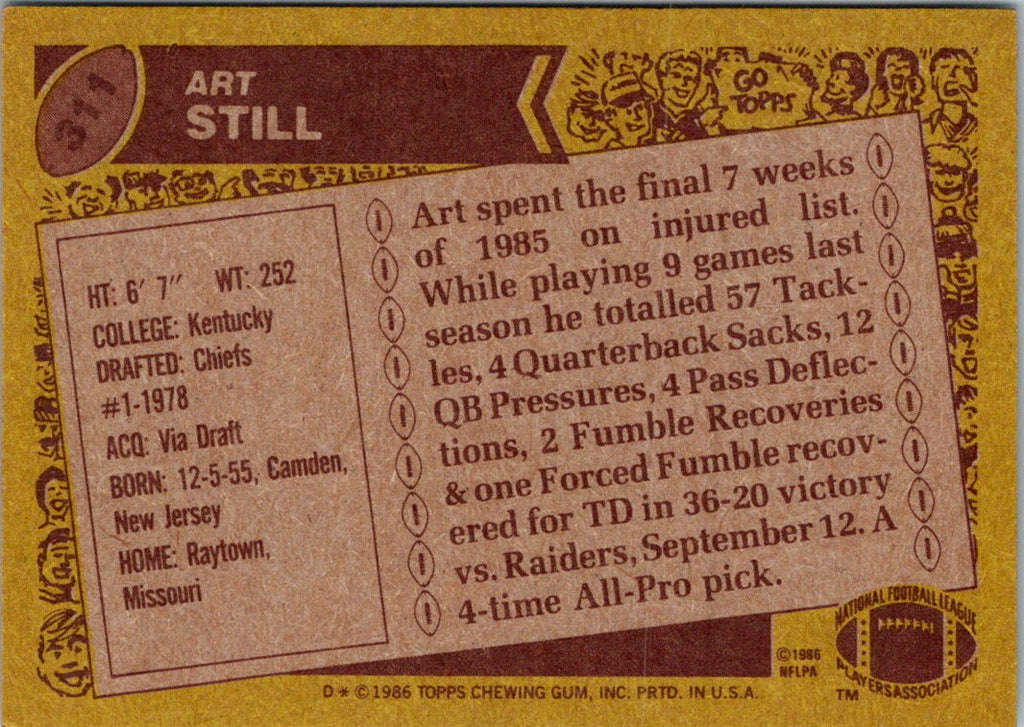 This 1986 Topps Art Still #311 is the perfect collectible for any Kansas City Chiefs fan! Featuring an iconic image of the team, this card is sure to become a cherished piece of your collection. With vivid colors and a glossy finish, this card is sure to stand out in any fan's collection. The card's sturdiness and durability make it an excellent choice for any collector. Add this classic card to your collection today and proudly display your love for the Kansas City Chiefs!